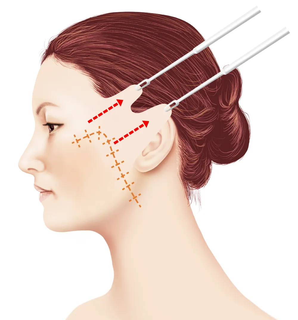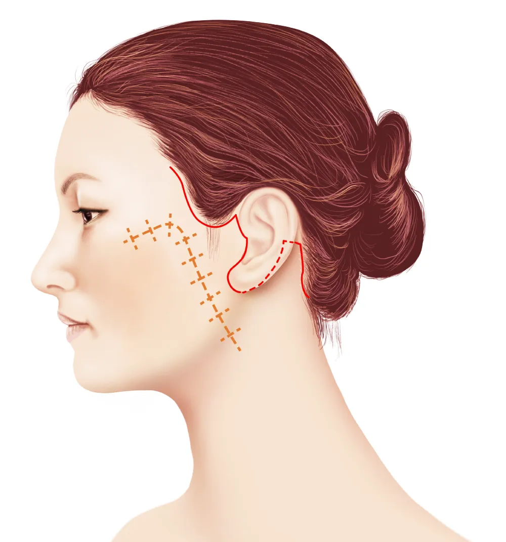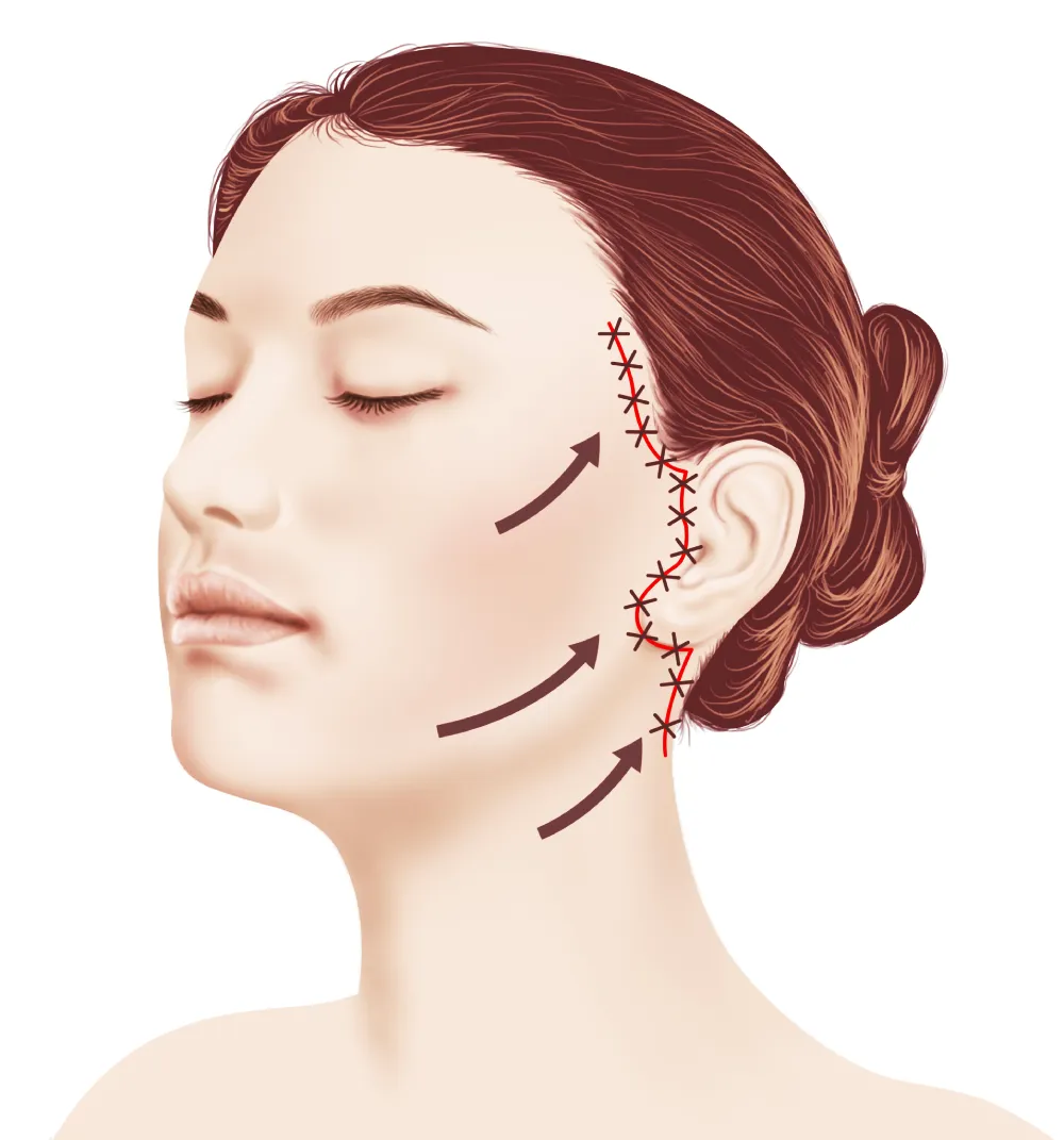 こめかみ、もみあげ、耳前から耳の後ろにかけての目立ちにくい部位を切開します。ネックリフトを行う場合は、後頭部の生え際まで切開を延長します。皮膚・皮下組織を丁寧に剥離し、顔の支持組織であるSMAS(表在性筋膜)を適切に処理することで、強固なリフトアップ効果を目指します。また、皮膚を固定しているリガメント(retaining ligament)にも処置を加え、引き上げ効果を高めます。