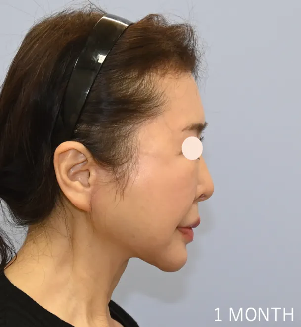 術後1ヵ月でフェイスライン・顎下のもたつきが改善し、リフトアップ効果が明らかです。