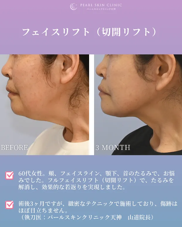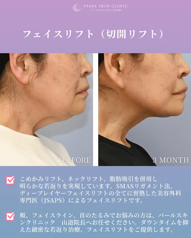 根本からたるみを引き上げる、パールスキンクリニック天神の切開フェイスリフト